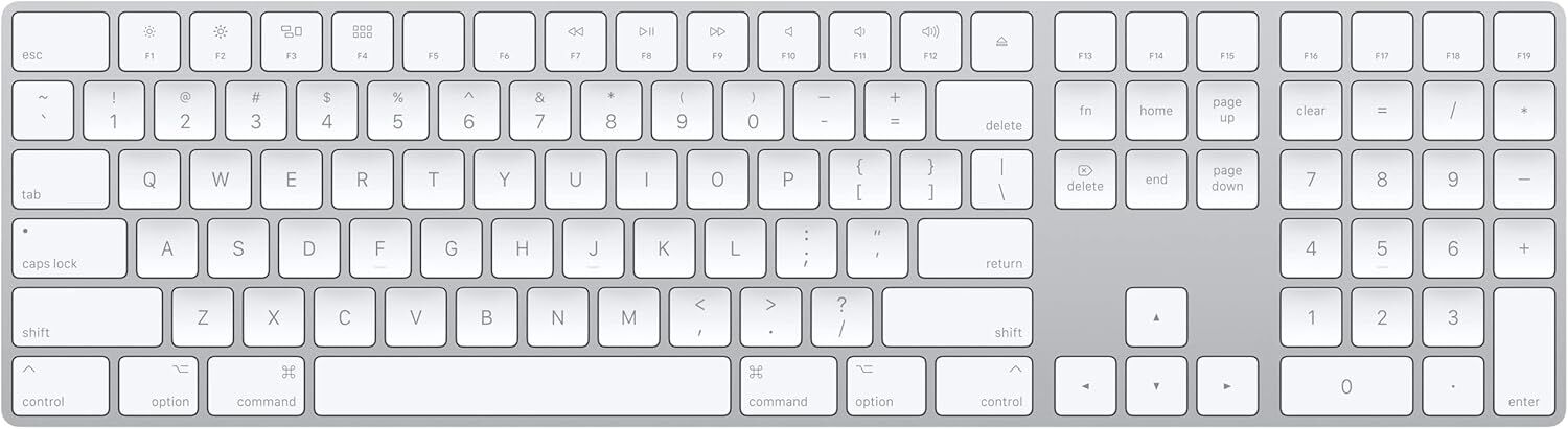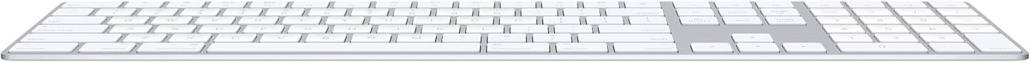 • Magic Keyboard with Numeric Keypad features an extended layout, with document navigation controls for quick scrolling and full-size arrow keys for gaming. A scissor mechanism beneath each key allows for increased stability, while optimized key travel and a low profile provide a comfortable and precise typing experience. The numeric keypad is also great for spreadsheets and finance applications. And the built-in, rechargeable battery is incredibly long-lasting, powering your keyboard for about a month or more between charges.